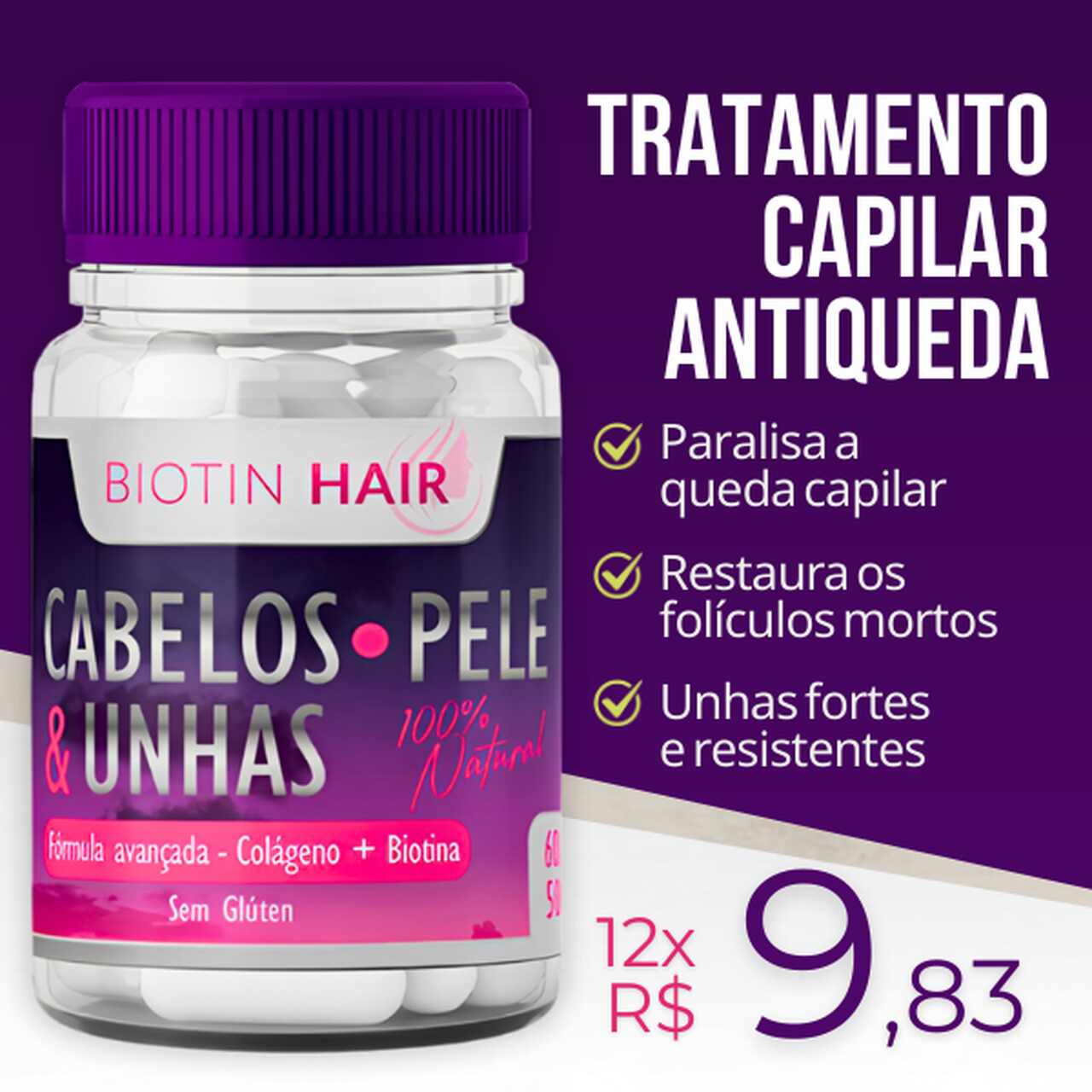Produto para fortalecer cabelos, estimular crescimento e reduzir a queda dos fios.